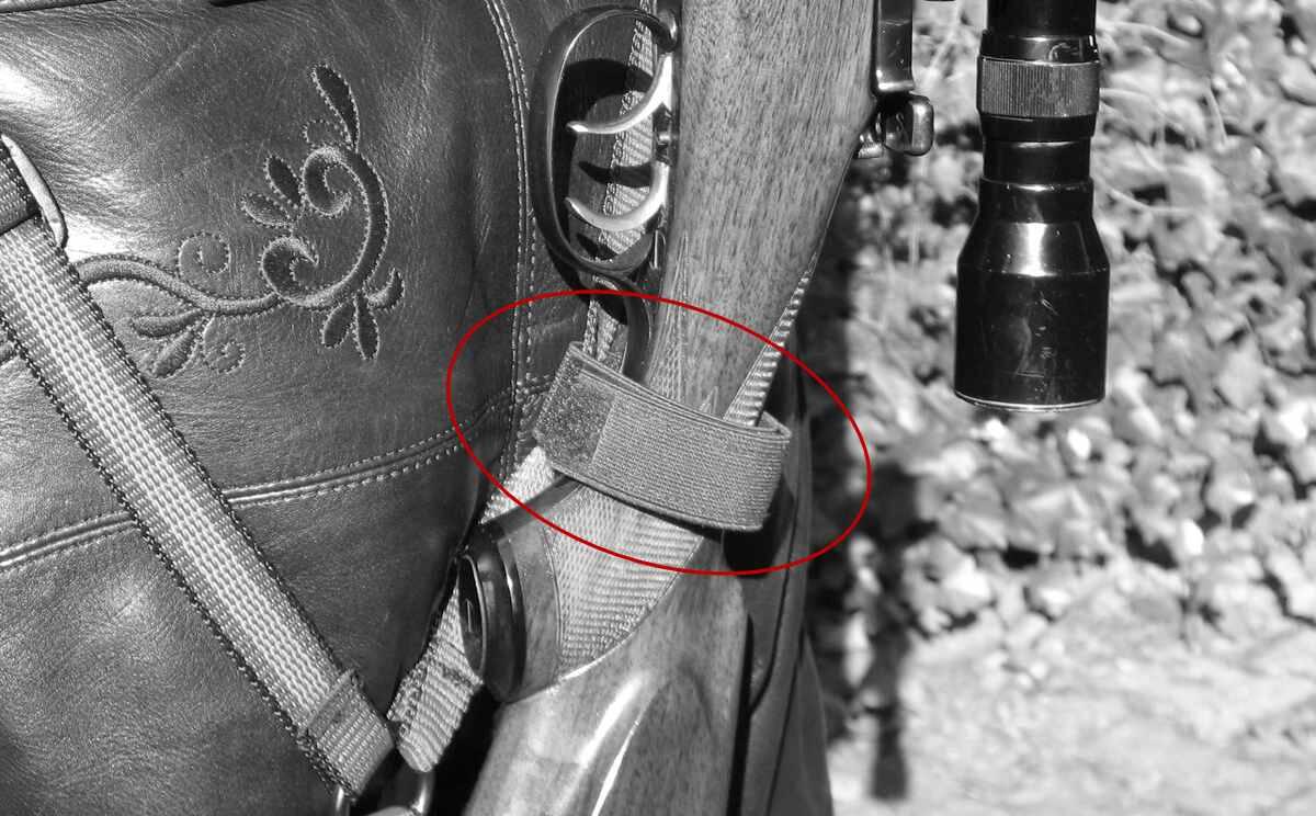 - Zur Stabilisierung der Waffe auf dem Rücken kann bei Bedarf der variabel auf dem Gurtband verschiebbare Fixiergurt (im Lieferumfang enthalten) um den Gewehrkolben geklettet werden