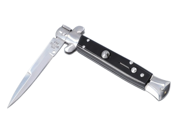 Dieses elegante Springmesser hat einen raffinierten Öffnungs-/Schließmechanismus und eine schmal zulaufende Klinge aus Edelstahl. Entsichert lässt sich das Messer schnell und einfach per Knopfdruck öffnen.