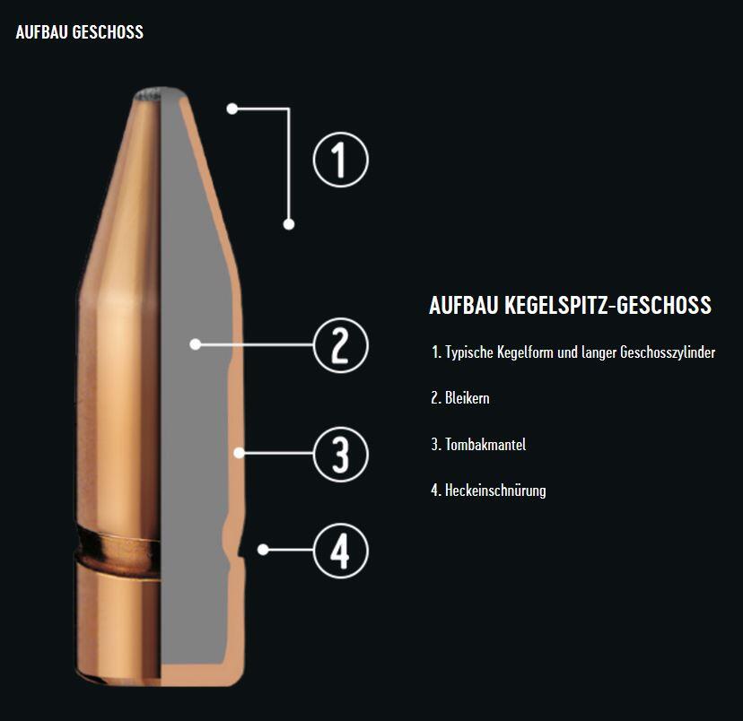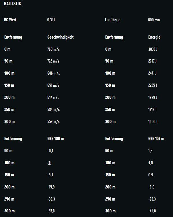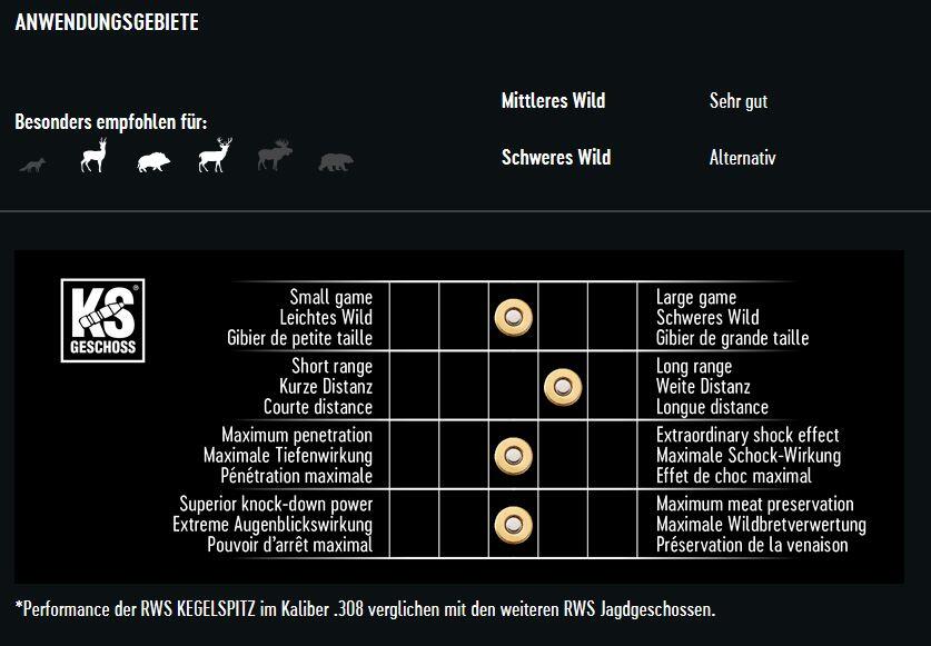 Die empfohlene Einsatzentfernung liegt bei bis zu 180 Metern. Die Wildbretschonung fällt unterschiedlich aus, während die Stoppwirkung als sehr hoch beschrieben wird. Ein Ausschuss ist in der Regel vorhanden. Der Rückstoß ist leicht, bei einem Geschossgewicht von 10,5 Gramm. Es handelt sich nicht um bleifreie Munition. Besonders geeignet ist sie für den Einsatz bei der Drückjagd.