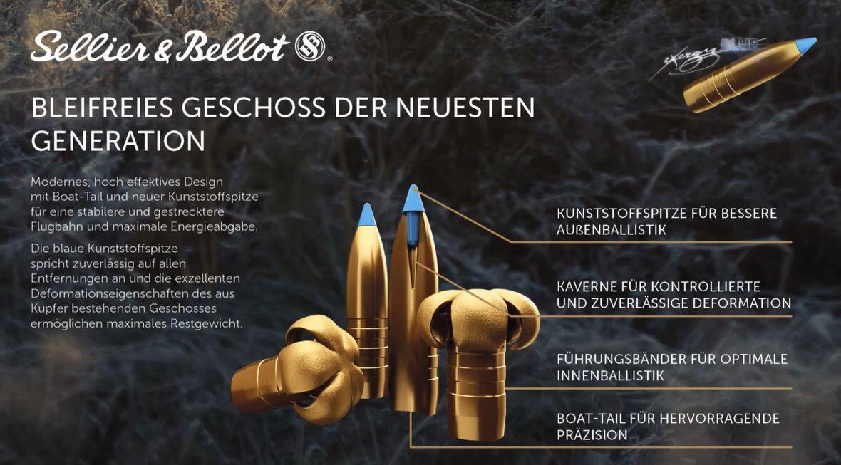 Das bleifreie aus Kupfer bestehende Deformationsgeschoss mit blauer Kunststoffspitze und Boat-Tail sorgt für eine stabilere und gestrecktere Flugbahn und ist daher auch auf weite Entfernungen bis 200 Meter und darüber hinaus bestens geeignet. Die neu entwickelte Geschossspitze spricht zuverlässig und schnell an. Exzellente Deformationseigenschaften, hervorragende Präzision und maximale Energieabgabe sind nur wenige Eigenschaften dieser qualitativ hochwertigen bleifreien Jagdbüchsenpatrone.