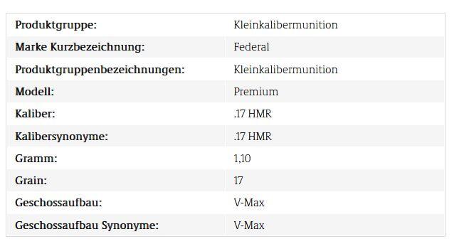 Artikelbeschreibung "Federal Kleinkalibermunition Premium .17 HMR 1,1g V-Max"