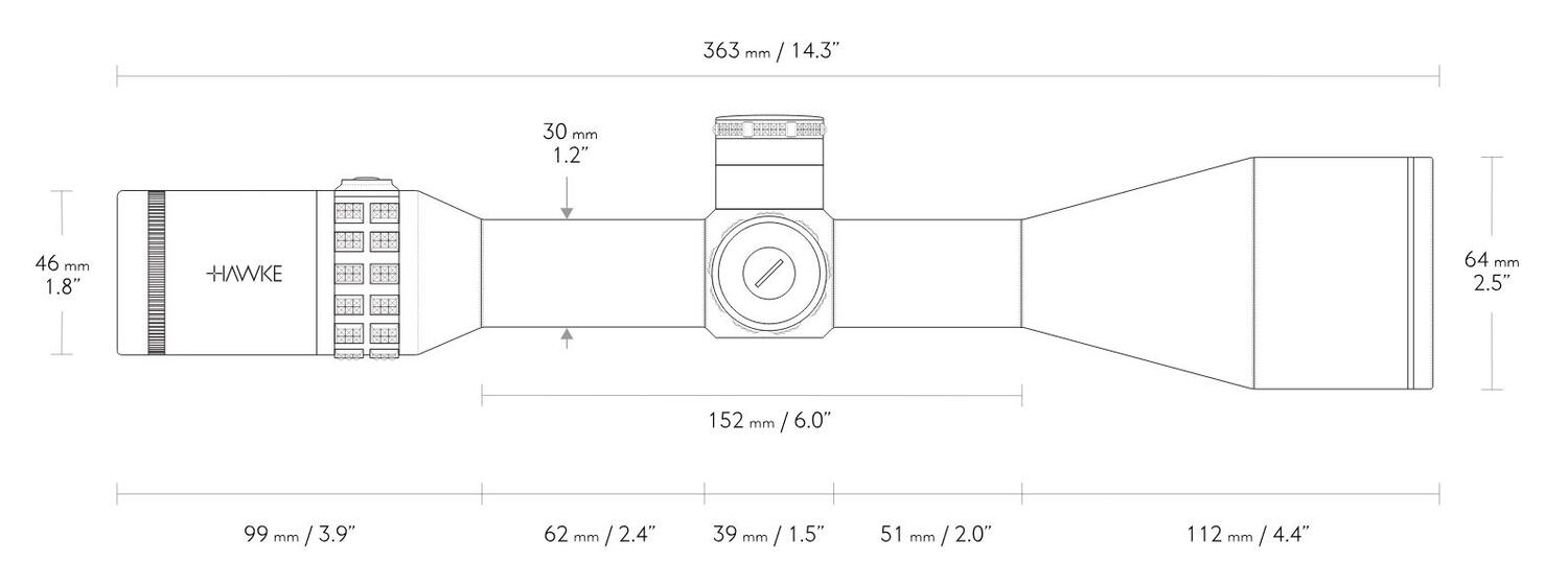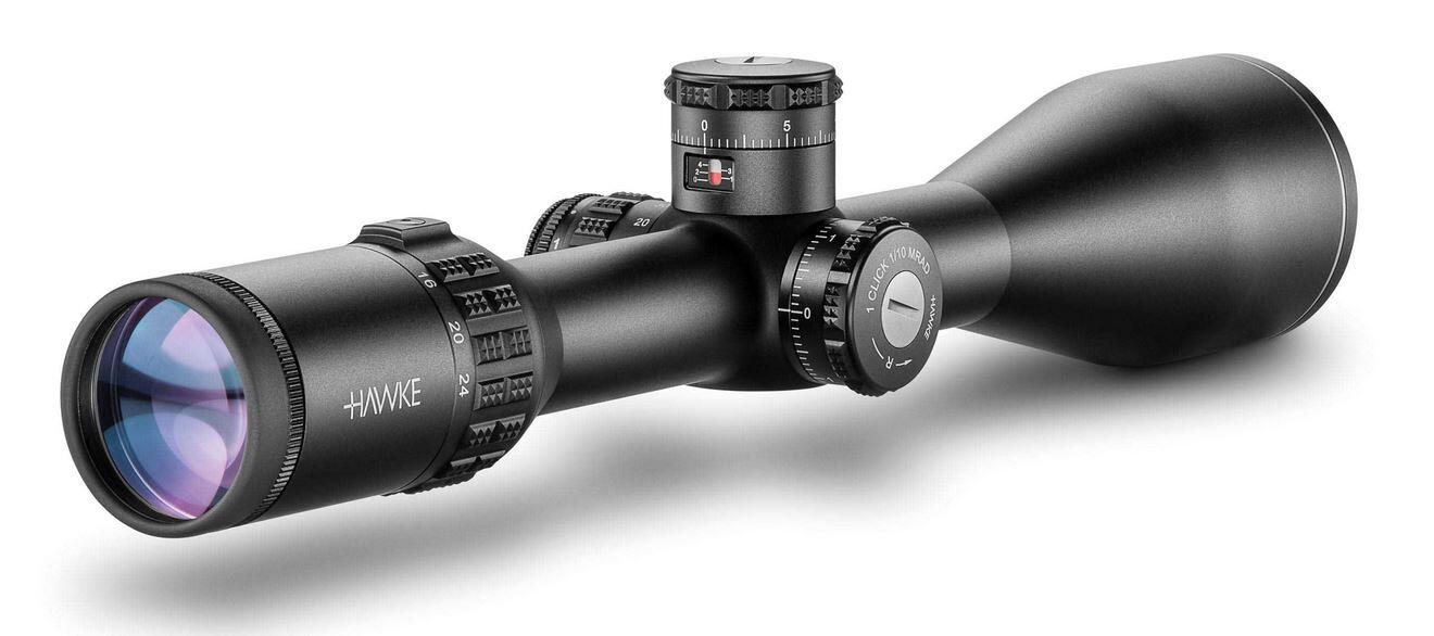 All models are equipped with the new Hawke H5 optical system, which features an ultra-wide 24° field of view and a generous 10 cm eye relief. The lockable precision adjustment turrets with 1⁄10 MRAD increments now feature an integrated scale, allowing the current turret position to be read visually at a glance.