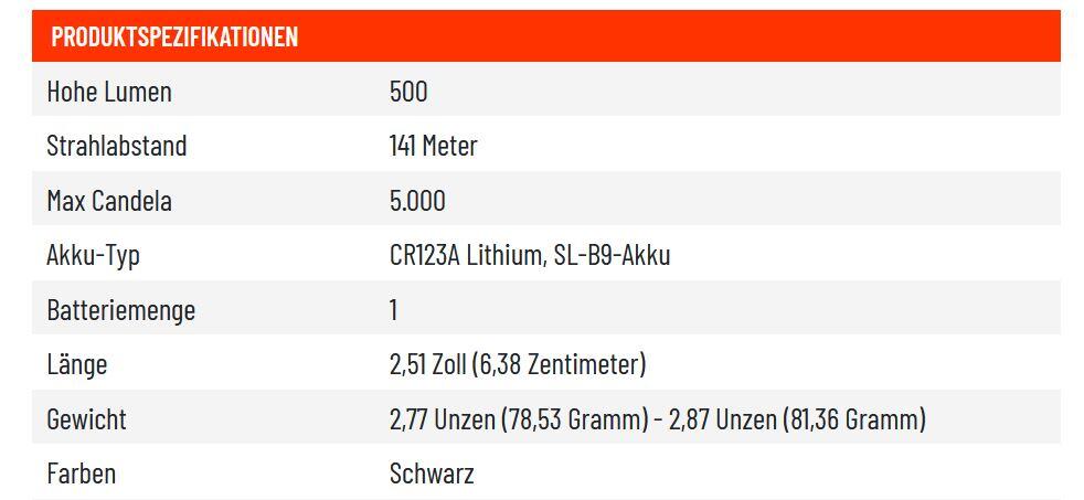 • 500 Lumen, 5.000 Candela, Lichtstrahl 141 m; Betriebsdauer 1,5 Stunden (CR123A) bzw. 1 Stunde (SL-B9)