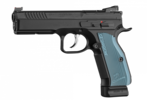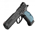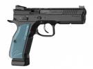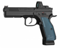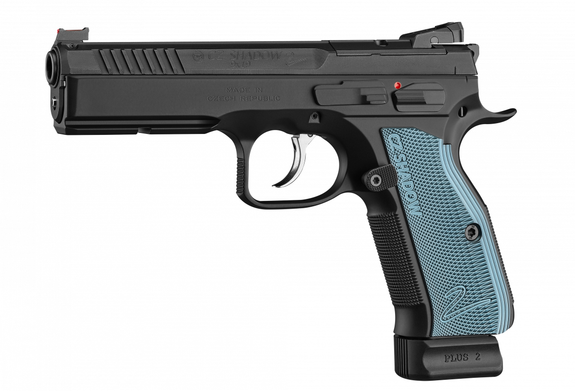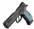 Wettkampfwaffe. Die nächste Generation der CZ 75 SP-01. Entwickelt in Zusammenarbeit mit dem CZ IPSC Team! Prägnante Merkmale sind ein verlängerter Schlitten und Lauf, verstellbare Visierung. Verstellbarer Magazinauslöser. Verkürzter Abzugsweg. Neues Oberflächenfinish. Vergrößertes Checkering am "Front- und Backstrap. High Grip Beavertail. Triangular Hammer. Blaue Aluminium Griffschalen. 19+1 Magazinkapazität. Mit Ausfräsung auf dem Schlitten, in die eine konfektionierte Montageplatte geschraubt werden kann, um ein Rotpunktgerät zu montieren. Die Ausfräsung kann durch die mitgelieferte Abdeckplatte verschlossen werden.