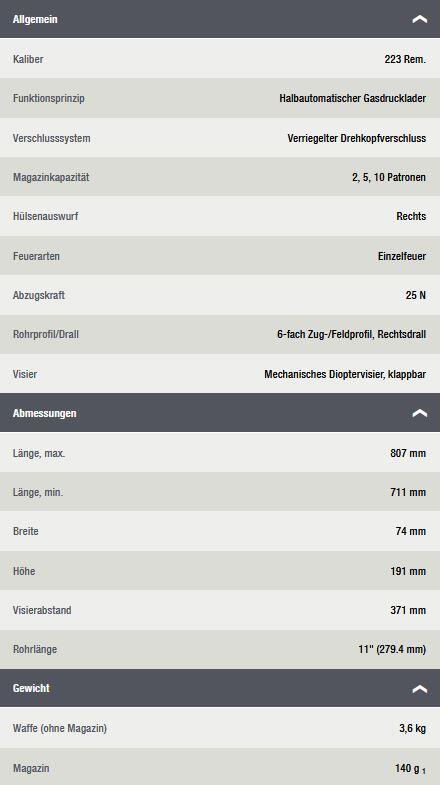 Das MR223 ist in den Rohrlängen 11, 14.5 und 16.5 Zoll erhältlich. Die kaltgehämmerten und hartverchromten Präzisionsrohre sind freischwingend und sorgen für erstklassige Treffergebnisse. Dies gilt sowohl für schießsportliche Disziplinen als auch für das jagdliche Schießen. Der Slim Line Handschutz mit HKey-Schnittstellen sitzt passgenau auf der verlängerten Rohrmutter und bietet eine Vielzahl an individuellen Sonderausstattungsmöglichkeiten. Die ausziehbare Slim Line Schulterstütze macht das MR223 extrem führig und mittels Rastpositionen kann sie optimal auf die Länge zum Körper eingestellt werden. Der aufgeweitete Magazintrichter unterstützt schnelle Magazinwechsel und ist für Magazine nach NATO-STANAG-Standard kompatibel.